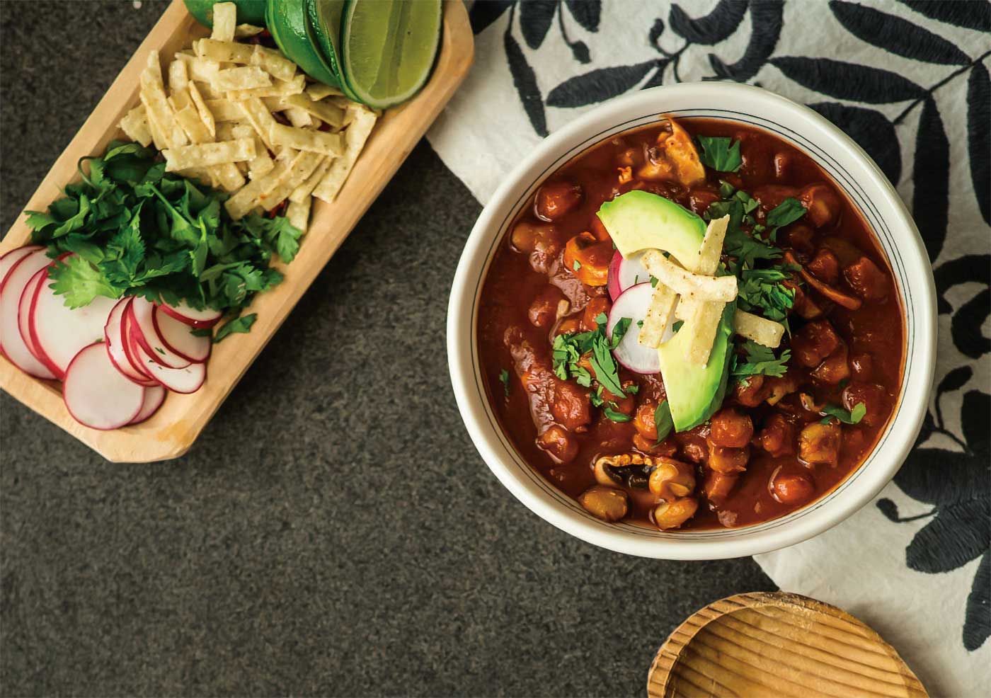 • Serve the vegan pozole hot, garnished with sliced radishes, chopped cilantro, chopped onion, lime wedges, shredded cabbage, avocado slices and tortilla chips.